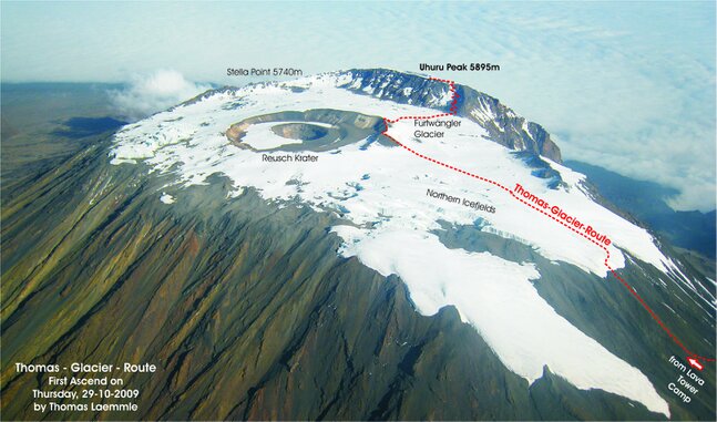 Eventuell teilt sich am Barranco Camp die Gruppe. Die Aspiranten für die "Thomas-Glacier-Route" steigen am 9. Tag zum Lava Tower auf, am 10. Tag wird eine Akklimatisationstour bis auf 5000m unternommen und am 11. Tag geht es über die Thomas-Glacier-Route zum Gipfel, an dem sich beide Gruppen wieder treffen.